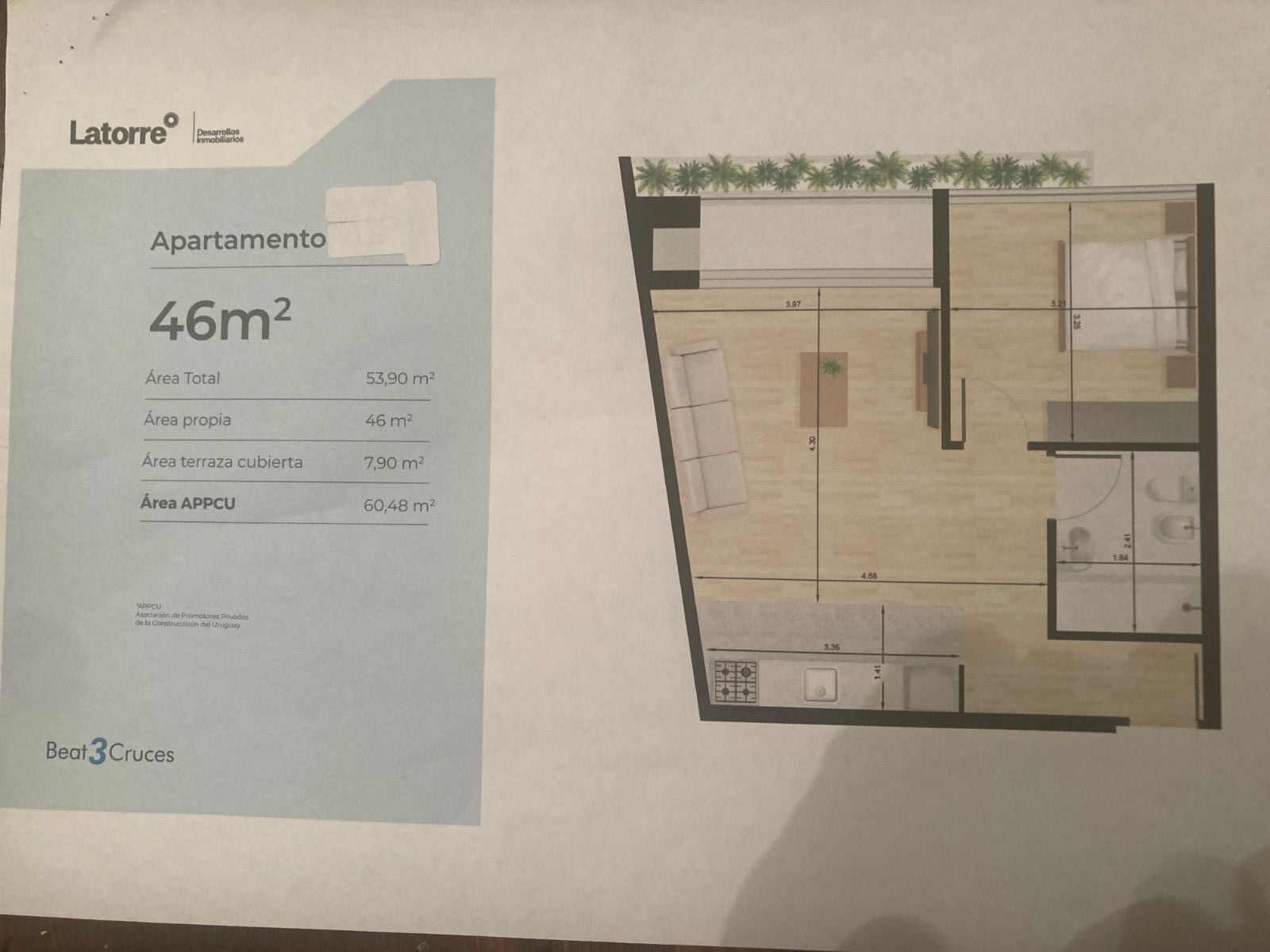 Exclusivos apartamentos en venta en la calle Cufré y Migueletes, ubicados en la prestigiosa zona de Tres Cruces. Con una superficie total de 46 m², este moderno inmueble en construcción ofrece 1 dormitorio, 1 baño y una distribución de 2 ambientes, ideal para quienes buscan confort, diseño y excelentes terminaciones. La orientación este garantiza una excelente iluminación natural en todos los espacios, creando un ambiente acogedor y luminoso en todo momento. Además, cuenta con una terraza y parrilla privada, perfectas para disfrutar de reuniones al aire libre con familiares y amigos. El precio de esta unidad es de U$D 100.190.